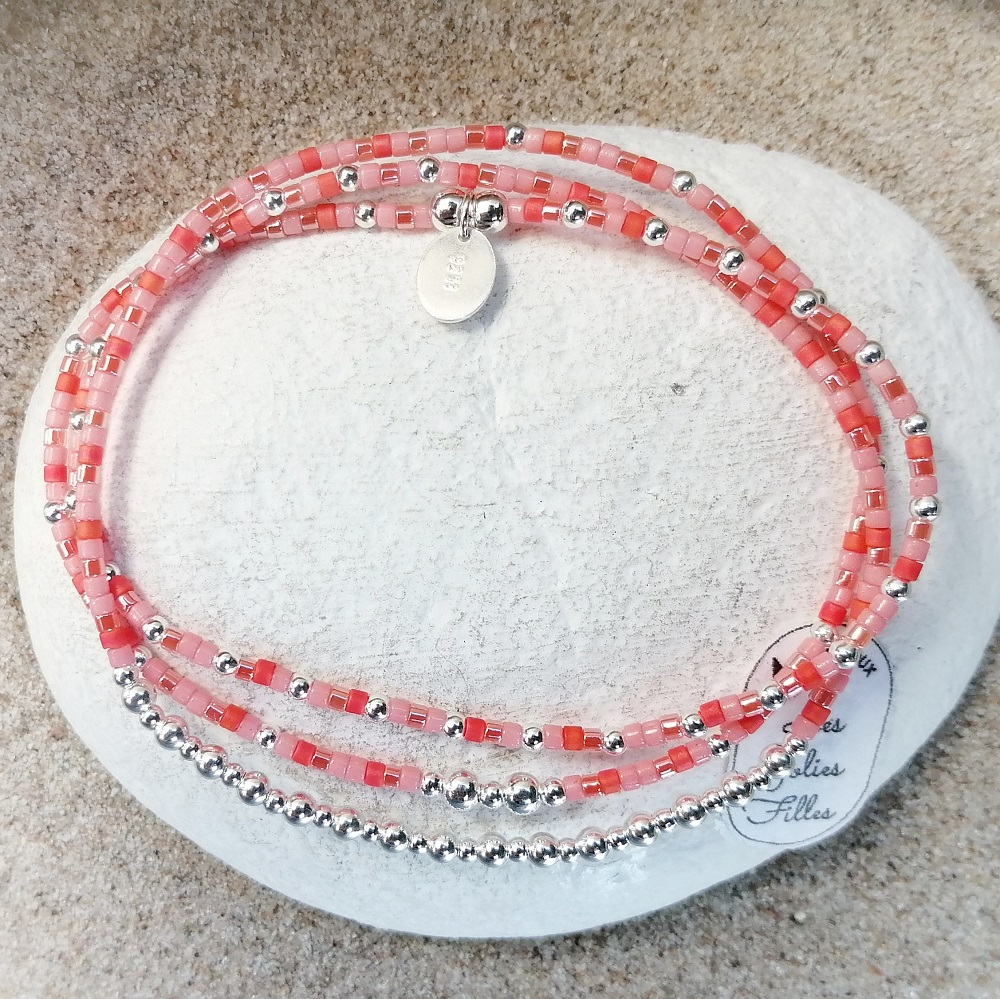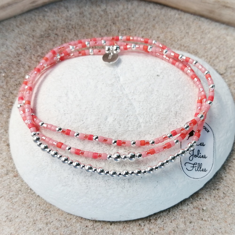 Bracelet triple tour «jolie bulleuse» argent élastique – rose/corail
